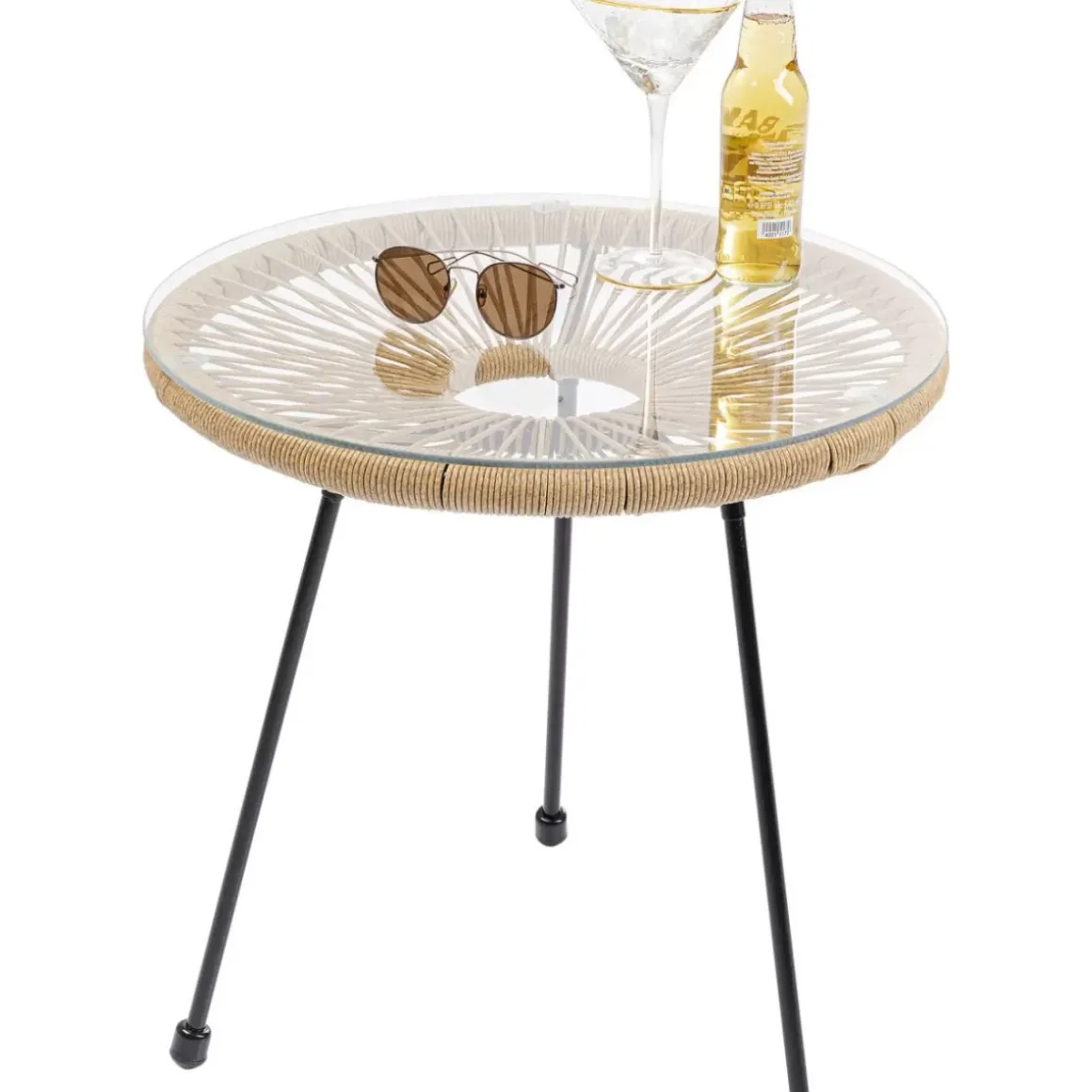 - Runder Beistelltisch Mit Glasplatte,Schwarzen Stabilen Beinen Aus Stahl Und Naturfarbenem Geflecht