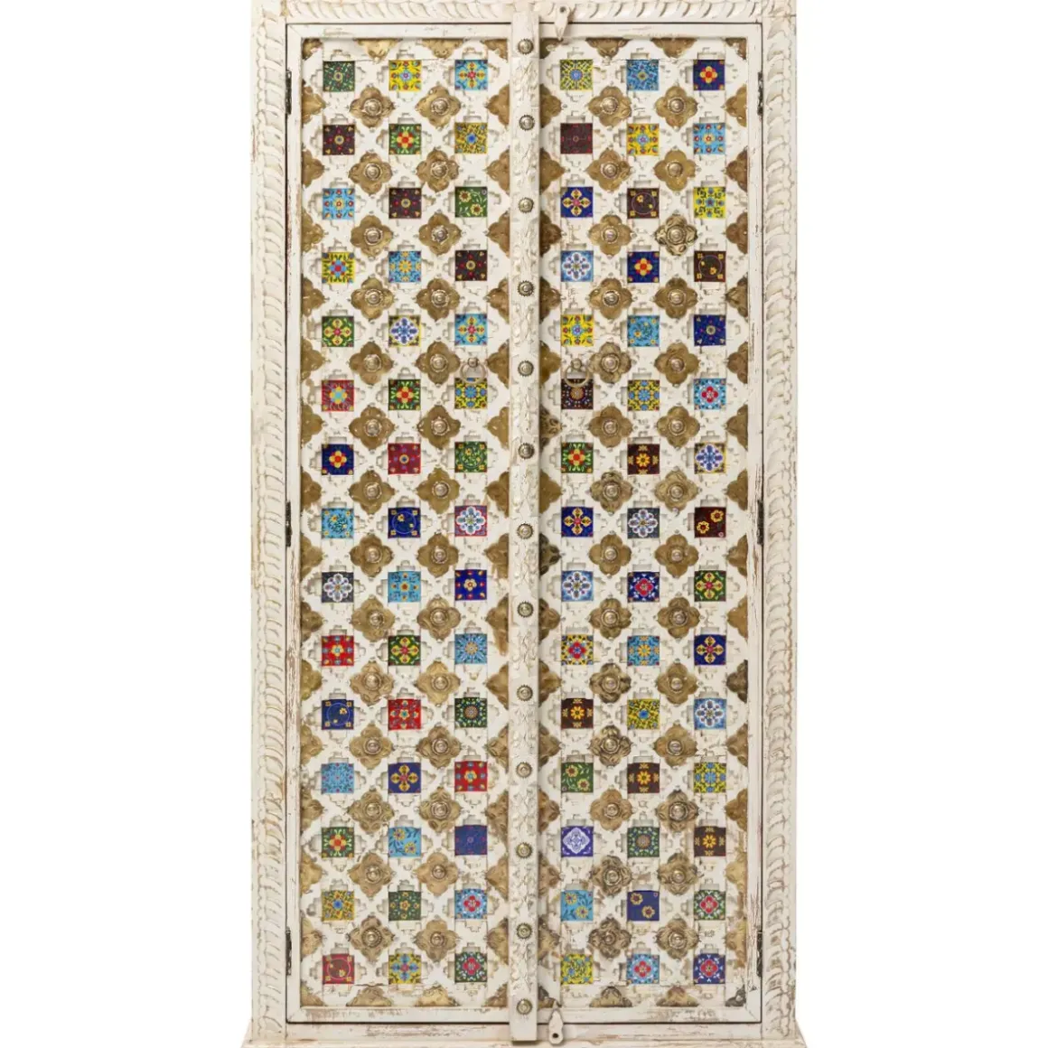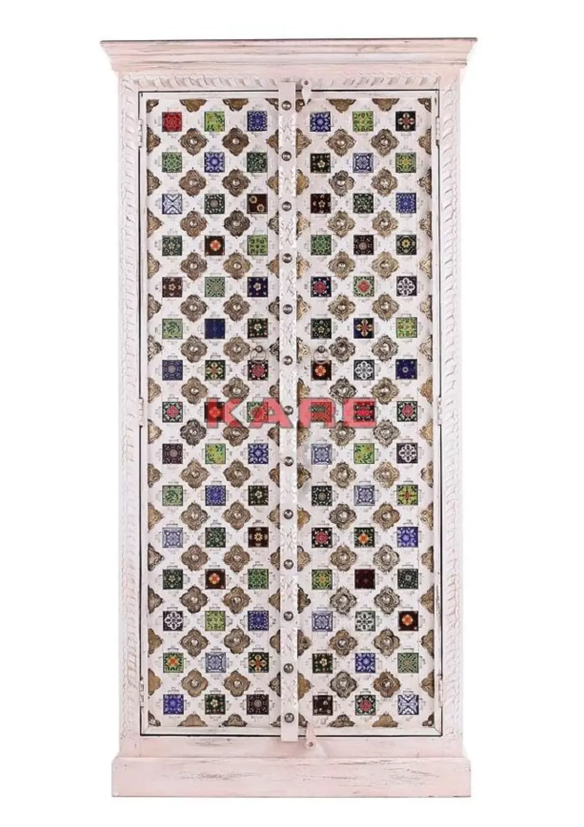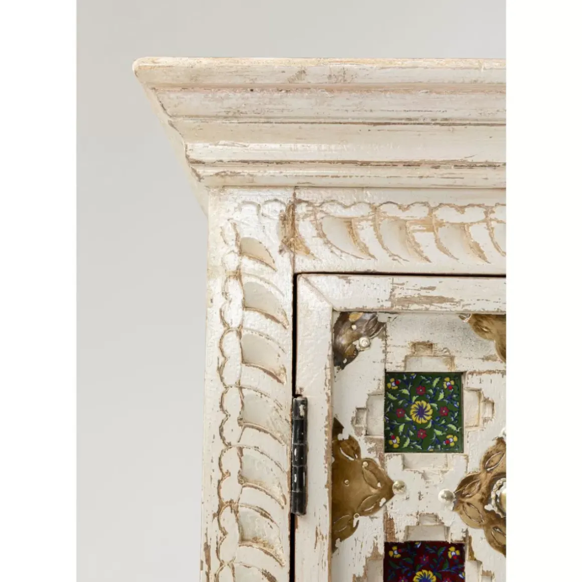 - Massivholz-Schrank Mit Aufwandigen Schnitzereien,Messingfarbenen Metallverzierungen Und Bunt Gemusterten Kacheln