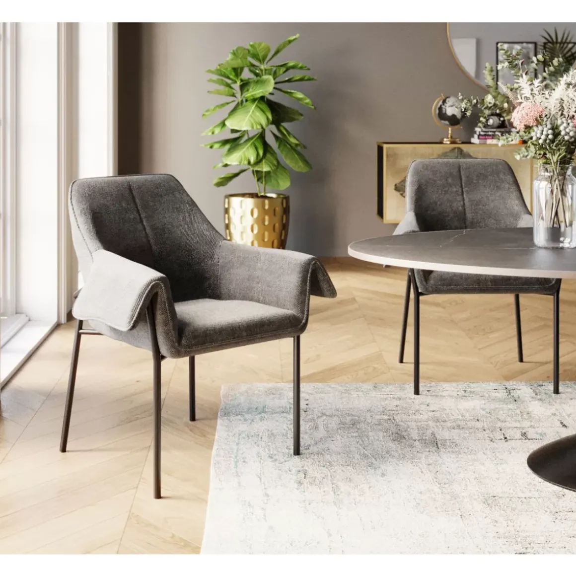 - Grauer Armlehnstuhl Mit Schlanken Metall-Beinen In Schwarz