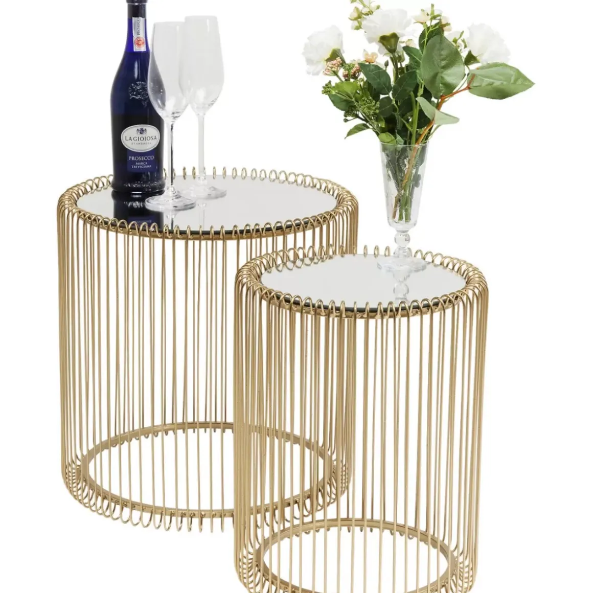 - Ein Beistelltisch-Set Mit Hohem Glam-Faktor: Spiegeltischflachen Und Die Grazil Geflochtene Drahtkonstruktion In Schimmernder Messingoptik Sind Ein Elegantes Upgrade