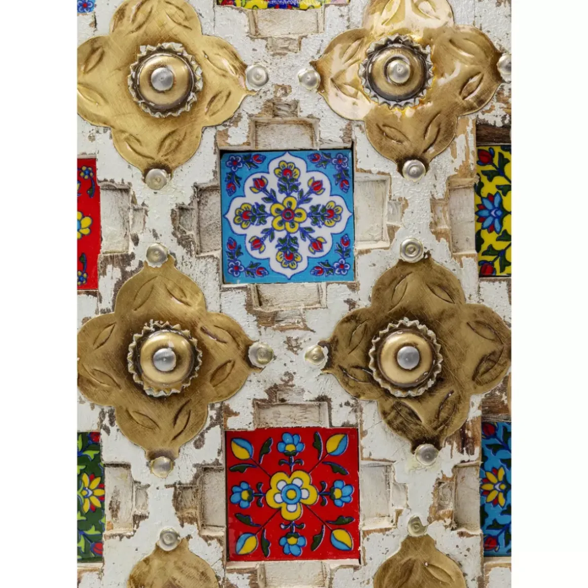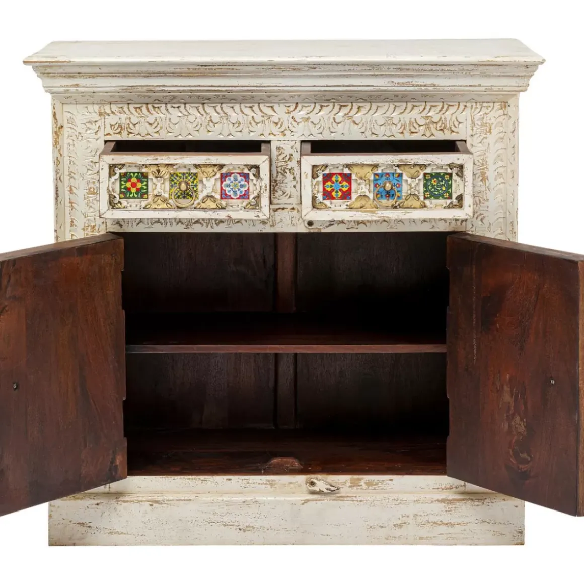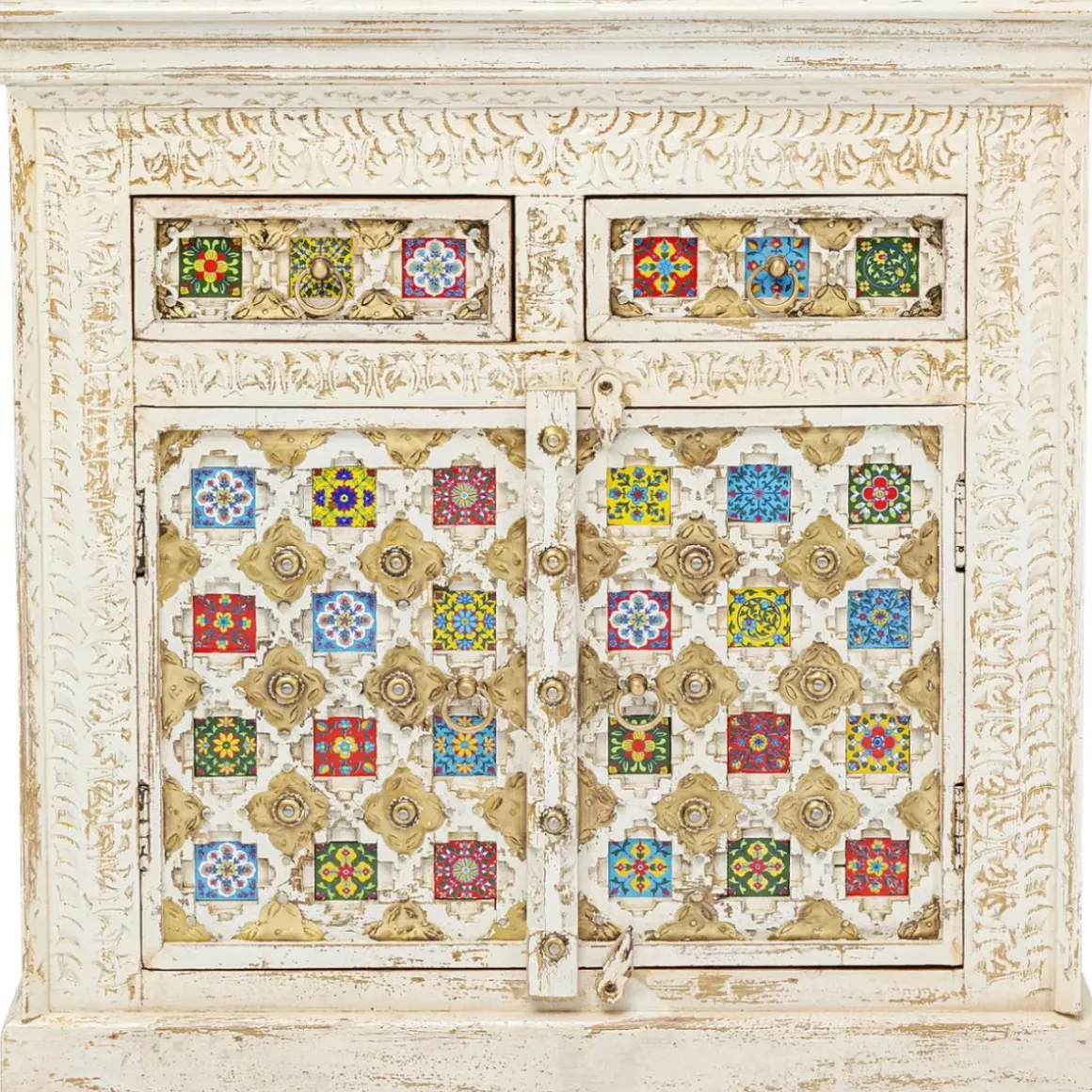 - Massivholz-Kommode Mit Aufwandigen Schnitzereien,Messingfarbenen Metallverzierungen Und Bunt Gemusterten Kacheln