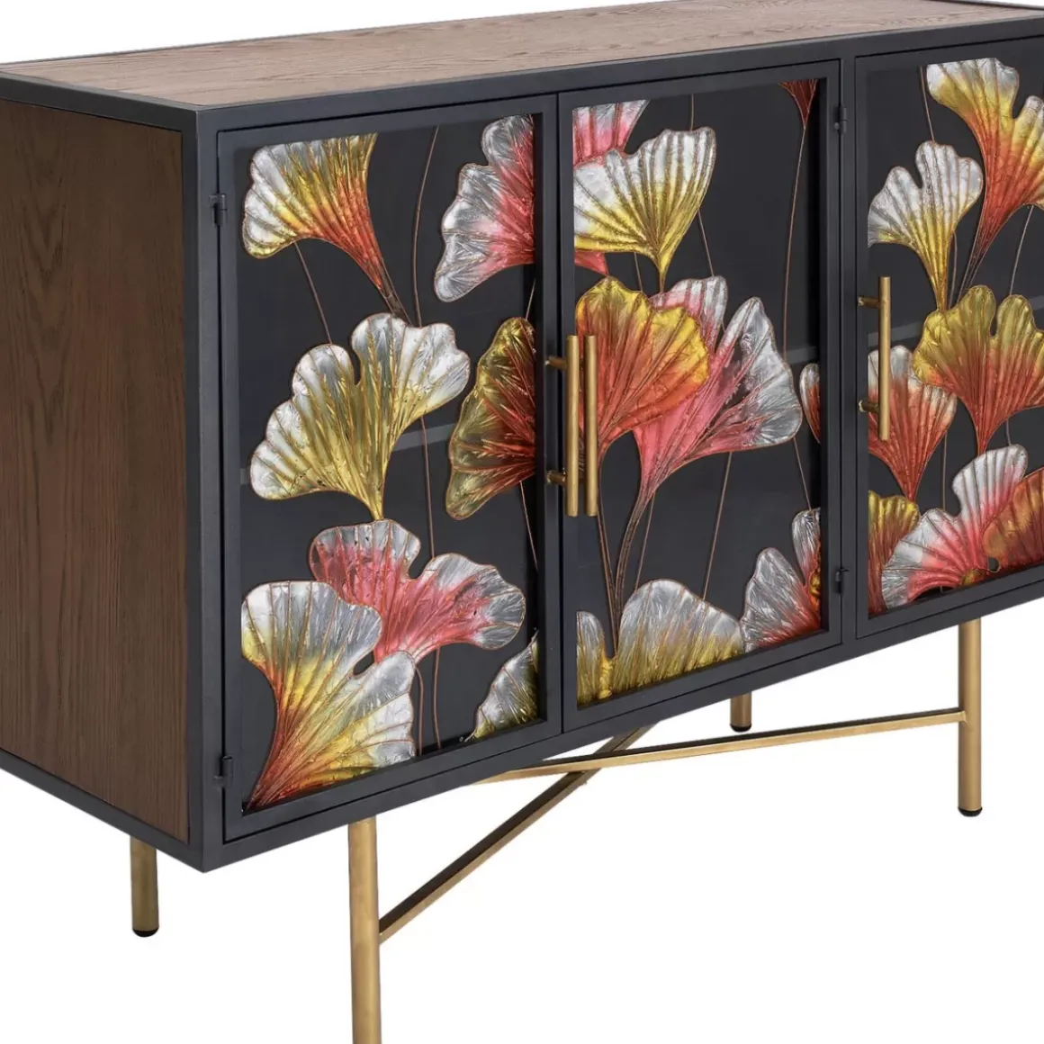Kleines,Buntes Sideboard 80 X 105 X 35 Zentimeter (H/B/T) Mit Esche-FurnierholzVon Hand Mit Bunten Ginkgo-Blattern Bemal…