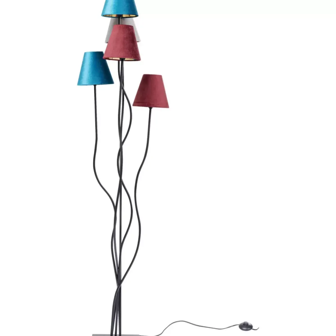 - Ausergewohnliche Stehleuchte Mit Funf Schirmen In Blau,Grau Und Rot,Die Sich Jeweils In Ein Hubsches Samtkleid Geworfen Haben